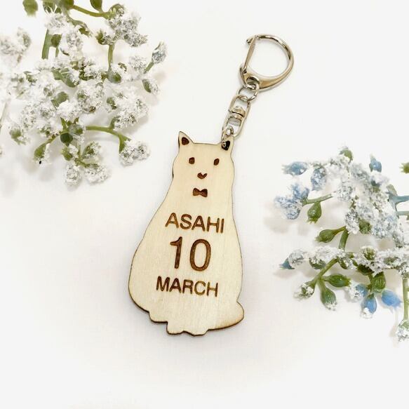 ぬくもりを感じる木で作った、お名前と誕生日入りのネコキーホルダー